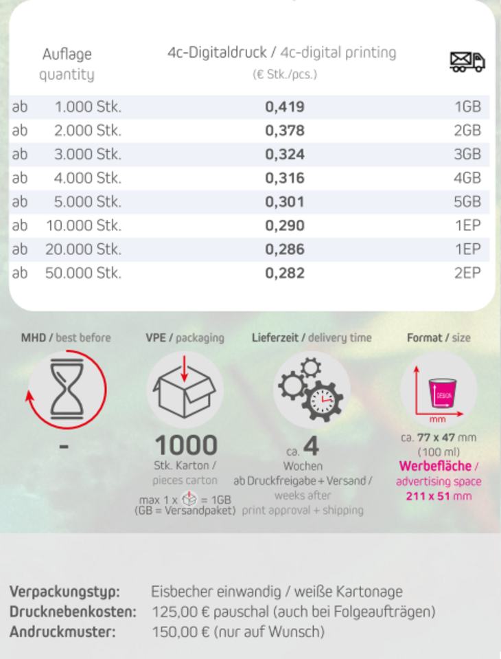 Produkt: Pappbecher einwandig / weiße KartonageBeschreibung: 100% Papier auf Wasserbasis innen BeschichtungFormat: ca. 77 x 47 x 77 mm, 100 mlLieferzeit: 3-4 Wochen ab Druckfreigabe + VersandDruck: 4c-DigitaldruckWerbefläche: 211 x 51 mmVPE: 1000 Stk. / KartonMindestbestellmenge: 1000 Stück