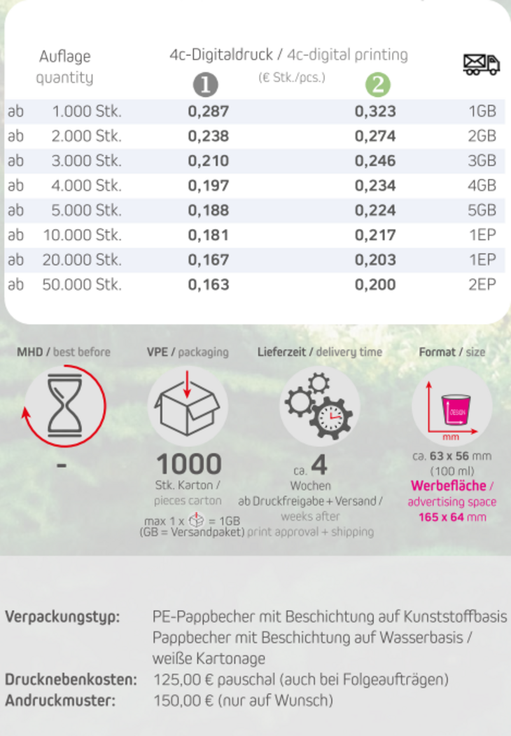 Preisliste Pappbecher mit Logo Details
