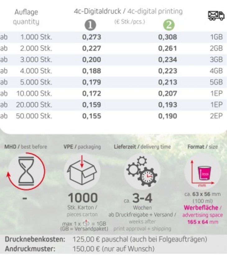 Produkt: Pappbecher einwandig / weiße Kartonage. Auch als Ökoversion ohne Logo möglich (Art.Nr.01478)Format: ca. 63 x 56 mm, 100 mlWerbefläche: 165 x 64 mmLieferzeit: 3-4 Wochen ab Druckfreigabe + VersandVPE: 1000 Stk. / KartonMindestbestellmenge: 1000 Stück