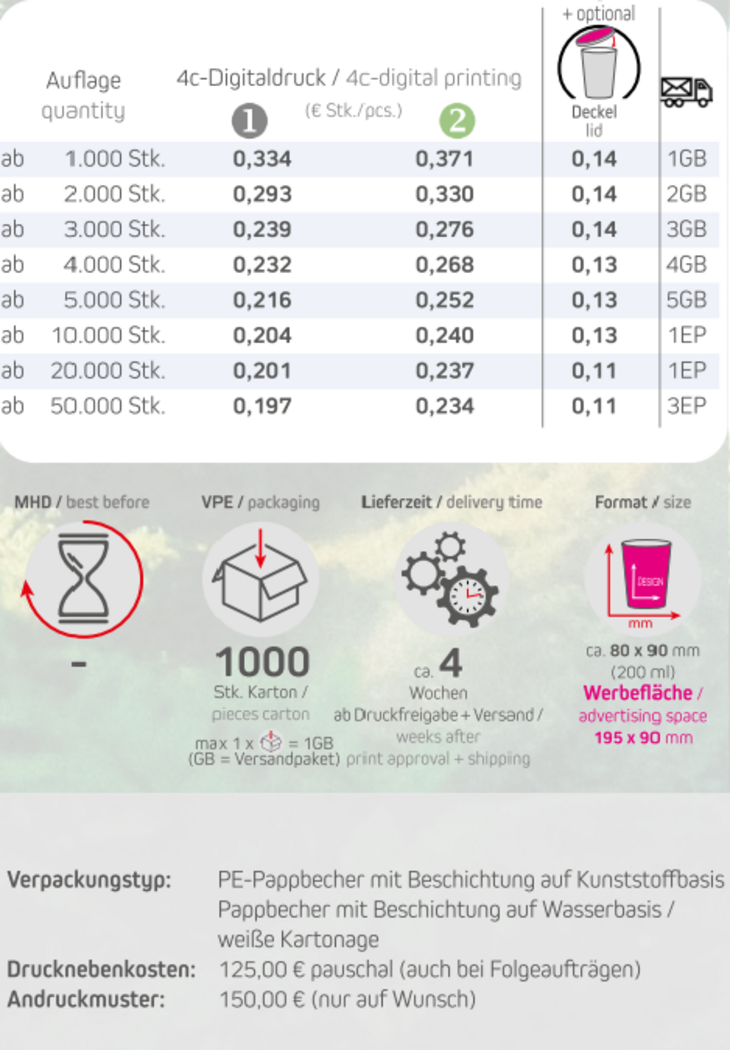 Preisliste Pappbecher 200 ml mit Logo Details