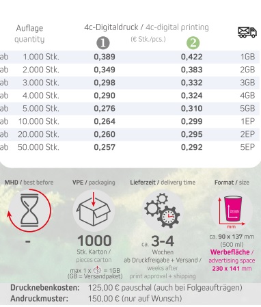 Produkt: Pappbecher einwandig / weiße Kartonage. Auch als Ökovariante ohne Logo möglich (Art.Nr.01750)Format: ca. 90 x 137 mm, 500 mlWerbefläche: 230 x 141 mmLieferzeit: 3-4 Wochen ab Druckfreigabe + VersandVPE: 1000 Stk. / KartonMindestbestellmenge: 1000 Stück.