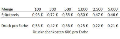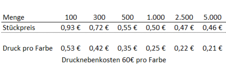 Maße: ca. 42 x 176 x 4 mmGewicht: 18 gFarben: weiß, rot oder blauDruckart: TampondruckDruckfläche: 18 x 40 mm (max. 4c)Verpackungs-Einheit: 80 je Unterkarton / 480 je VersandkartonMindestbestellmenge: 100 StückLieferzeit: ca. 10 Arbeitstage nach Druckfreigabe