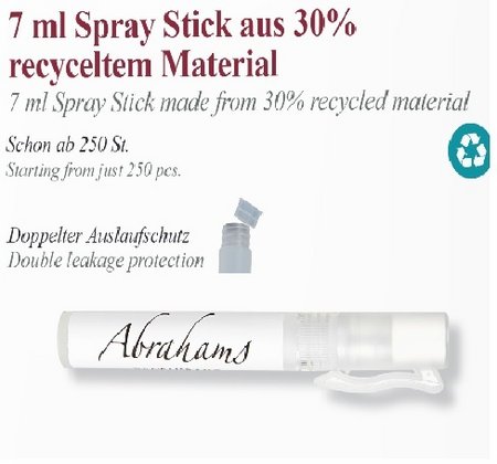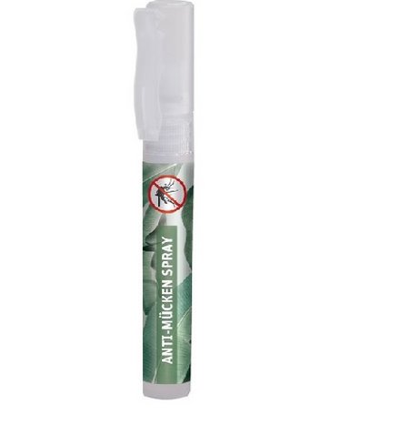 Das Anti-Mücken Spray bietet einen zuverlässigen Schutz vor Insektenstichen und Zeckenbisschen. Einfach gleich mäßig auf die Haut aufsprühen, verreiben und eintrocknen lassen. Schon hilft es bis zu 8 Stunden gegen Mücken und bis zu 4 Stunden gegen Zecken. Das Anti-Mücken Spray wirkt auf natürliche Basis durch Zitroneneukalyptusöl.Das Produkt ist für Kinder ab 1 Jahr geeignet und dermatologisch getestet.Beschreibung: 7 ml Spray Stick: transparent gefrostet und Kappe mit Clip,in der Standardfarbe transparent mit 4c Rundum-Etikett.4c Rundum-EtikettDruckfläche: 55,5 x 70 mmMindestbestellmenge: 1.000 Stück