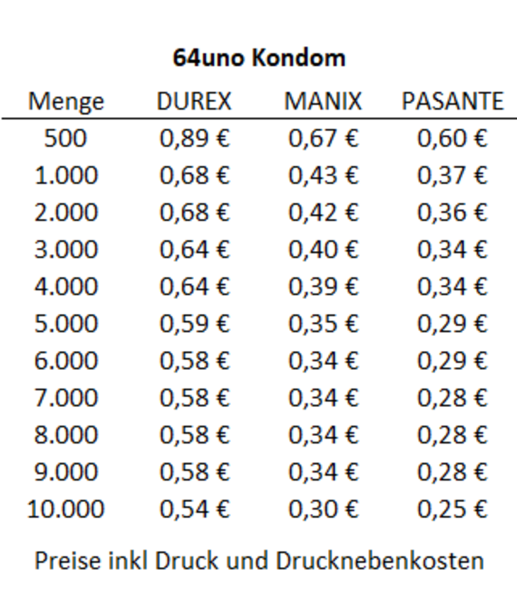 Kondom als Werbemittel in individuell bedrucktem Werbebriefchen.Erhältlich in den verschiedenen Marken: Durex, Pasante, ManixGröße: 64 x 64 mmInhalt: 1 Kondom (Marke nach Wahl)Druck: Vierfarb-Offsetdruck CMYK auf der AußenseiteEinfarbig Schwarz auf der Innenseite *Trägermaterial: Hochwertiges weißes 240g-Papier; FSC®-zertifiziertLieferzeit: 2 bis 3 Wochen ab Druckfreigabe oder nach AbspracheVerpackung: Beutel mit 500 Stück in Kartons mit bis zu 2.000 Einheiten