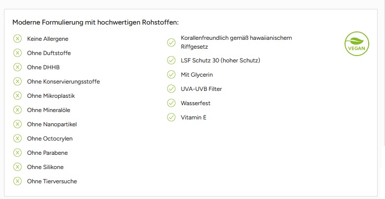 Sensitive Sonnenmilch - LSF 30, parfümfrei ohne Duftstoffe (Hohes Schutzniveau).Wasserfeste und schnell einziehende Sonnencreme mit Vitamin E und Glycerin für 24-Stunden-Langzeitfeuchtigkeit. Sofortschutz mit ausgewogenem UVA- /UVB-Breitbandfilter.Verpackung: 50 ml Flasche weiß aus 100% recyceltem PETFüllung: Sonnenmilch senstiv LSF 30Tuben- und Deckelfarbe: weißDekoration: Body Label (Etikett weiß) auf Vorder- und RückseiteDruckart: Offset digitalDruckfarben: 4c (CMYK)Volumen: 50 mlHaltbarkeit: 3 Jahre / 6 Monate nach Anbruch bei sachgerechter Lagerung Lieferzeit: ca. 2-3 Wochen ab DruckfreigabeMindestbestellmenge: 250 StückHergestellt in DeutschlandDermatologisch "sehr gut" getestetOhne Octocrylene, Nanofrei, vegan, Kein Mikroplastik, Korallenfreundlich gemäß Hawaii-Riffgesetz, ohne Konservierungsstoffe, ohne Mineralöle, ohne Parabene, ohne Silikone