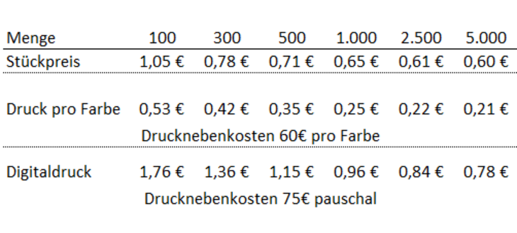 Maße: ca. 33 x 47 x 18 mmMindestmenge: 100 StückFarbe Vorderseite: weißFarbe Rückseite: rot, grün, orange oder blauDruckart: Tampondruck oder DigitaldruckDruckfläche: Tampondruck: Vorderseite: 21 x 16 mm, Rückseite: 21 x 32 Digitaldruck: 30 x 45 mm Verpackungs-Einheit: 125 je Polybeutel / 250 je Unterkarton / 1000 je VersandkartonLieferzeit: ca. 10 Tage ab Druckfreigabe