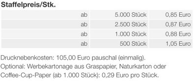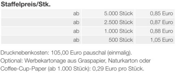 Werbung auf die italienische Art! Die kleinen GIOTTO Dreierstangen eignen sich besonders gut zum Teilen beim gemeinsamen Kaffee mit Kollegen und Kolleginnen oder als Messesnack. Ideal für Ihre Werbebotschaft. Klimaneutrales Produkt, auf FSC®-zertifiziertem Karton aus nachhaltiger Forstwirtschaft und anderen kontrollierten Quellen.Produktdetails: GIOTTO 3er, verpackt in einem individuellen WerbeschuberFormat: ca. 80 x 28 x 30 mmBedruckung: 4-farbiger Druck auf grafischem Premium-Karton (FSC ® -zertifiziert). Optional auf Graspapier, Naturkarton oder Coffee-Cup-Paper.Inhalt: GIOTTO 3er 12,9gLieferzeit: Lieferung ca. 10 - 15 Arbeitstage nach DruckfreigabeBestellmenge: Ab 500 Stück individuell bedruckt
