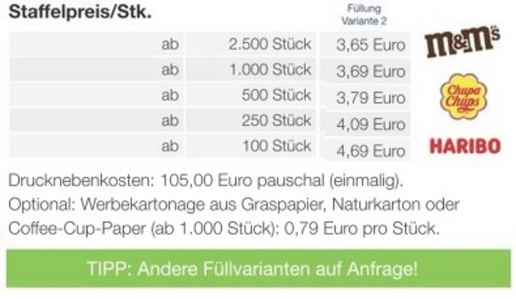 Ein süßer Gruß zum Start! Für den neuen „Goodie Bag“ mit leckerer Füllung gibt es viele Anlässe: Messe, Begrüßung neuer Mitarbeiter und Mitarbeiterinnen, Seminar, Konferenz oder Schulbeginn. Mit dieser kleinen Aufmerksamkeit begeistern Sie Ihre Zielgruppe. Klimaneutrales Produkt, auf FSC®-zertifiziertem Karton aus nachhaltiger Forstwirtschaft und anderen kontrollierten QuellenProduktdetails: Individuelle Werbekartonage in Schultütenform mit süßer FüllungBedruckung: 4-farbiger Druck auf grafischem Premium-Karton (FSC ® -zertifiziert). Optional auf Graspapier, Naturkarton oder Coffee-Cup-Paper.Format: ca. 90 x 90 x 213 mmInhalt: 1 M&M´s Choco 45g, 4 HARIBO Goldbären Tütchen je 10g, 2 Chupa Chups Lutscher. Andere Füllvarianten auf AnfrageLieferzeit/Zubehör: ca.15 Arbeitstage nach Druckfreigabe.Mindestbestellmenge: 100 Stück
