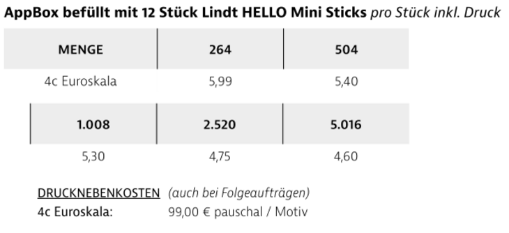 Preisliste Appbox befüllt mit Lindt HELLO mini Sticks mit Logo