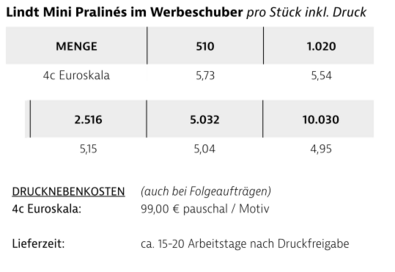 Preisliste Lindt Mini Pralinés im Werbeschuber mit Logo Details