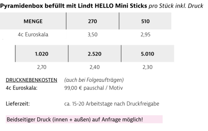 Preisliste Pyramidenbox mit Lindt HELLO Mini Sticks mit Logo