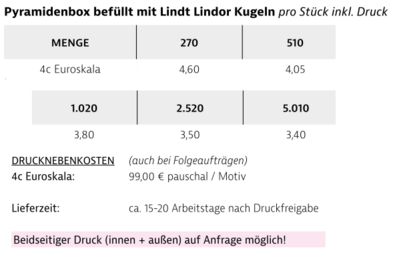 Preisliste Pyramidenbox mit Lindt Lindor Kugeln mit Logo