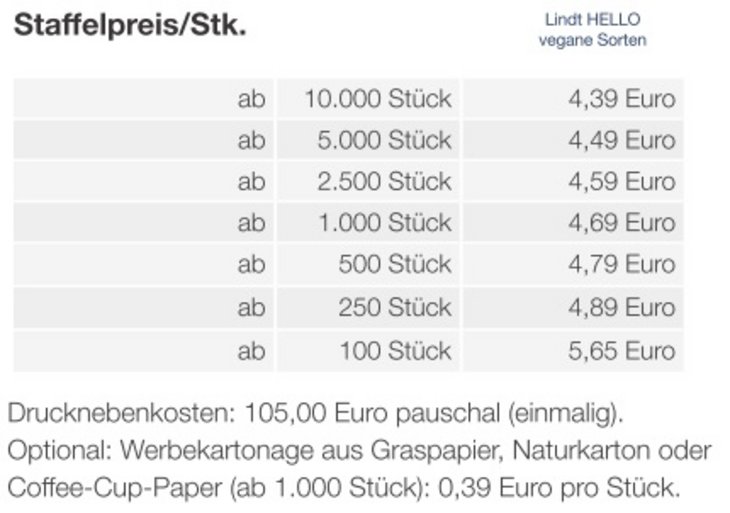 Preisliste Schokolade von Lindt HELLO vegan 100g mit Logo Details