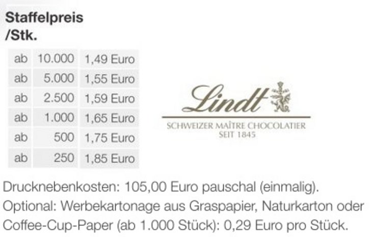 Preisliste Werbe-Klappkarte Schokoladenherz von Lindt 20g mit Logo Details