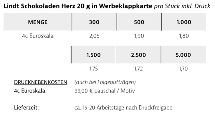 Werbeklappkarte individuell beidseitig bedruckt mit innenliegendem Lindt Herz aus Vollmilchschokolade 20g = (rot, blau, gold oder grün).Gewicht: Inhalt ca. 20gFarben: Herz: rot, blau, gold oder grünVerpackungsmaß: ca. 68 x 88 x 13 mm (geschlossen)Druckart: 4c-EuroskalaVerpackungseinheit: 50 St. im Karton / 300 St. im UmkartonHaltbarkeit: ca. 9 Monate bei sachgerechter LagerungLieferzeit: ca. 15-20 Arbeitstage nach DruckfreigabeMindestbestellmenge: 300 Stück