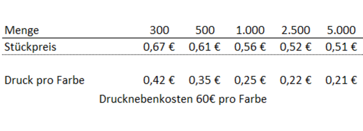 Maße: ca. 30 x 35 x 17 mmGewicht: 9 gFarbe: weißDruckart: TampondruckDruckfläche: Vorder- oder Rückseite 16x16 mm erpackungs-Einheit: 125 je Polybeutel / 625 je Unterkarton / 2500 je VersandkartonMindestmenge: 300 StückLieferzeit: ca. 10 Tage ab Druckfreigabe