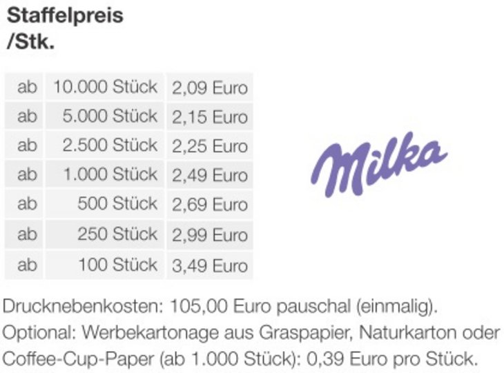 Transportiert Ihre Werbung optimal! Der individuell bedruckbare Transporter bringt Ihre Werbebotschaft bestens ans Ziel. Wählen Sie aus einer Vielzahl leckerer FüllvariantenProduktdetails: Individuelle Präsentverpackung aus hochwertiger Kartonage mit süßer Füllung. Nachhaltigkeit: Für jede Bestellung mit uns wird ein Baum über GROW MY TREE gepflanzt. Wir verwenden FSC ® -zertifizierten Karton aus nachhaltiger Forstwirtschaft und anderen kontrollierten QuellenTransporter: ca. 132 x 61 x 48 mm Bedruckung/Motive: 4-farbiger Druck auf grafischem Premium-Karton (FSC ® -zertifiziert). Optional auf Graspapier, Naturkarton oder Coffee-Cup-Paper.Inhalt : 4 Stück ca. 32g Ritter SPORT SchokowürfelHaltbarkeit: 6 MonateLieferzeit/Zubehör: Lieferung ca. 15 Arbeitstage nach Druckfreigabe.Gleich mitbestellen: Stabiler Einzelkarton für den Postversand an Ihre Kunden: 0,59 Euro pro Stück.Mindestbestellmenge: 100 Stück