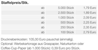 Ein Moment zum Durchatmen. Zwei aromatische Tees von Meßmer und eine zartschmelzende Lindor Praliné von Lindt vereinen sich zueinem Moment purer Entspannung. Die hochwertige Box lässt sich individuell mit Ihrem Logo oder Design bedrucken und wird so zum perfekten Präsent für Kunden und Mitarbeiter. Ein genussvolles Dankeschön mit StilProduktdetails: Teebeutel von Meßmer und eine Lindt Lindor Praliné, in einer individuellen WerbekartonageInhalt: 2 Teebeutel von Meßmer einzeln in Aromaschutzverpackung. Geschmacksrichtungen, bunt gemischt, z.B. „Energie“, „Detox your feelings“, „Entspannung“ und 1 Stück Lindt Lindor Praliné bunt gemischt ca. 16gBedruckung: 4-farbiger Druck auf grafischem Premium-Karton (FSC ® -zertifiziert). Optional auf Graspapier, Naturkarton oder Coffee-Cup-Paper.Verpackung: 60 Stück pro Karton, 3.240 Stück pro PaletteFormat: ca. 90 x 73 x 30 mm Einzelversandkarton für den Postversand: 0,59 Euro pro StückHaltbarkeit: 6 Monate. Lieferzeit/Zubehör: ca.15 Arbeitstage nach Druckfreigabe.Mindestbestellmenge: 100 Stück