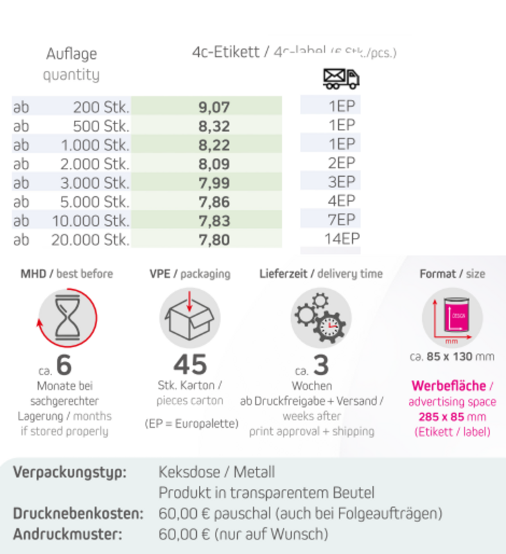 Produkt: Metalldose MaxiInhalt: Butter Herzen Kekse 100gFormat: ca. 85 x 130 mmWerbefläche: 4c-Etikett 285 x 85 mm Lieferzeit: ca. 3 Wochen ab Druckfreigabe + VersandVPE: 45 Stk. / KartonHaltbarkeit: ca. 6 Monate bei sachgerechter LagerungMindestbestellmenge: 200 Stück